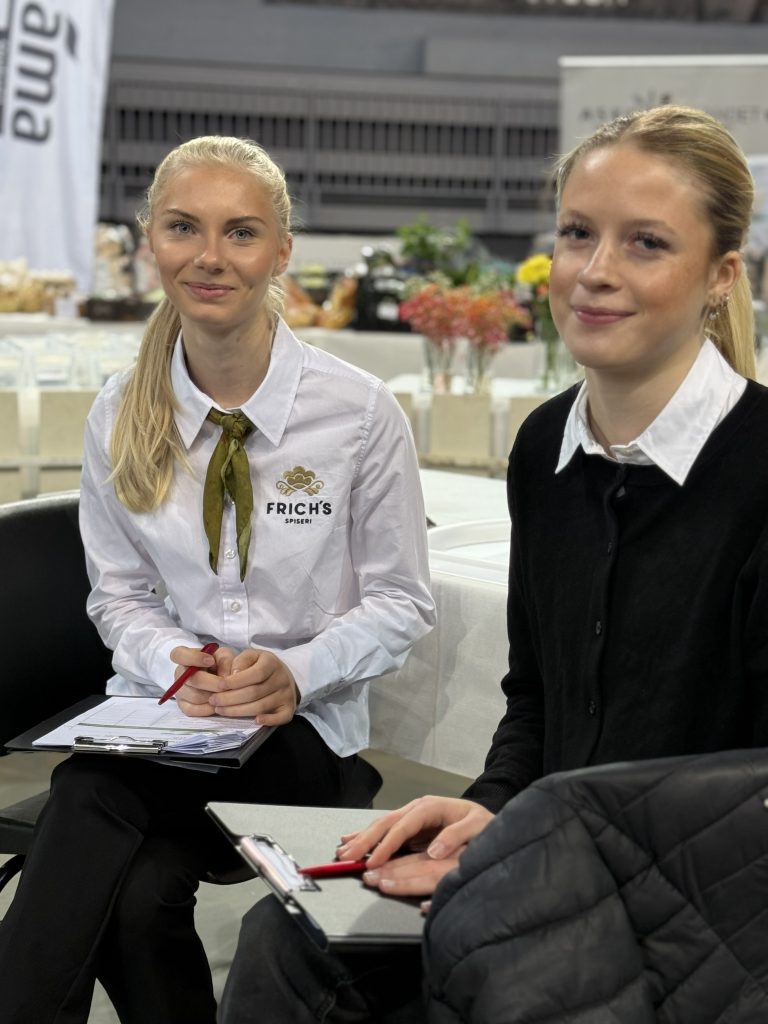 Servitørlærlingene Emma og Frida storkoste seg med jobben som meddommere i konkurransen, og fikk også i oppdrag å veilede elevene under konkurransen.